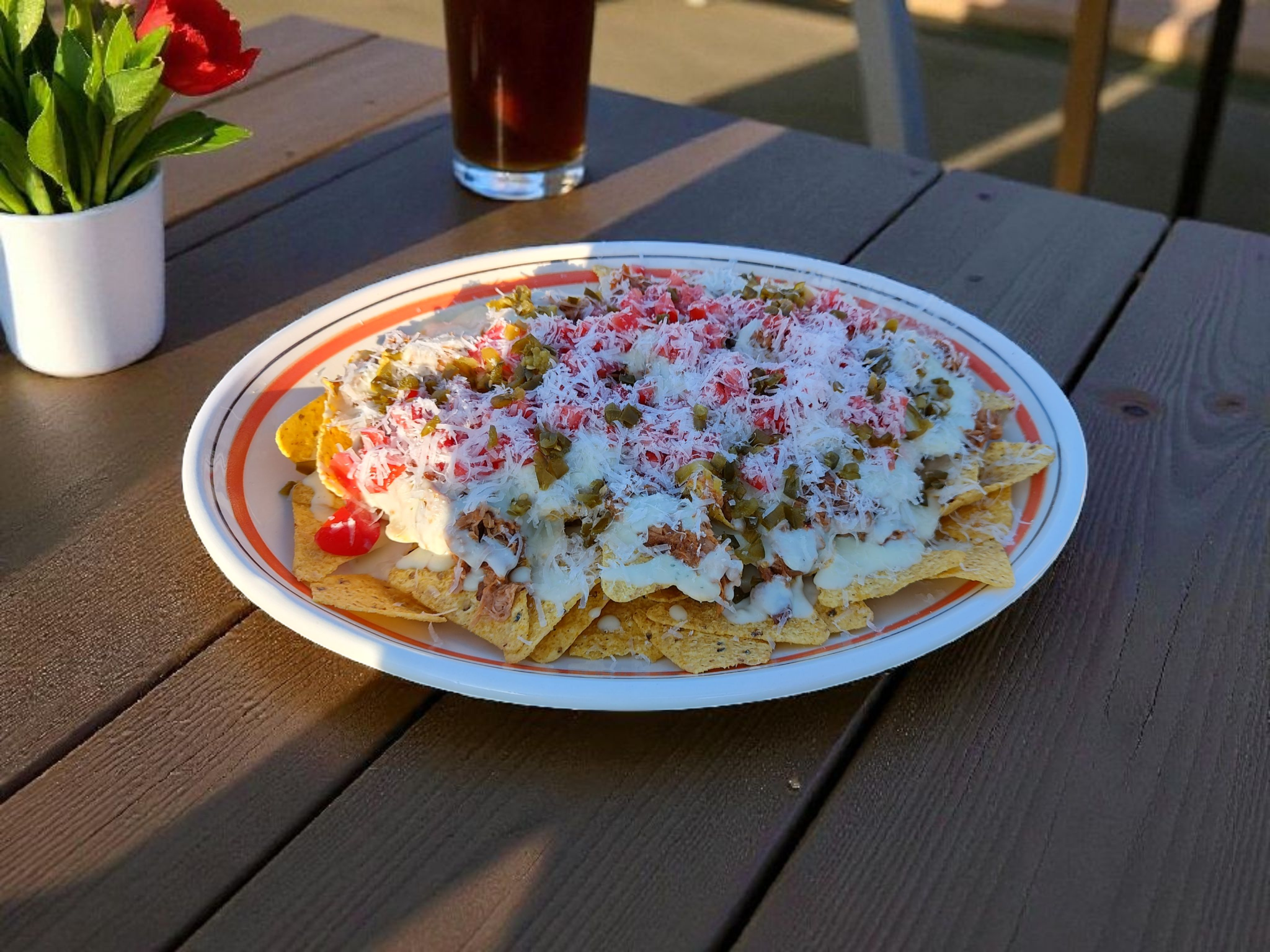 - Verdeel op de nacho's eerst de pulled pork, gevolgd door de béchamelsaus en vervolgens de tomaten en paprika’s. Werk tot slot af met een royale toets van Blues Hog Original saus.