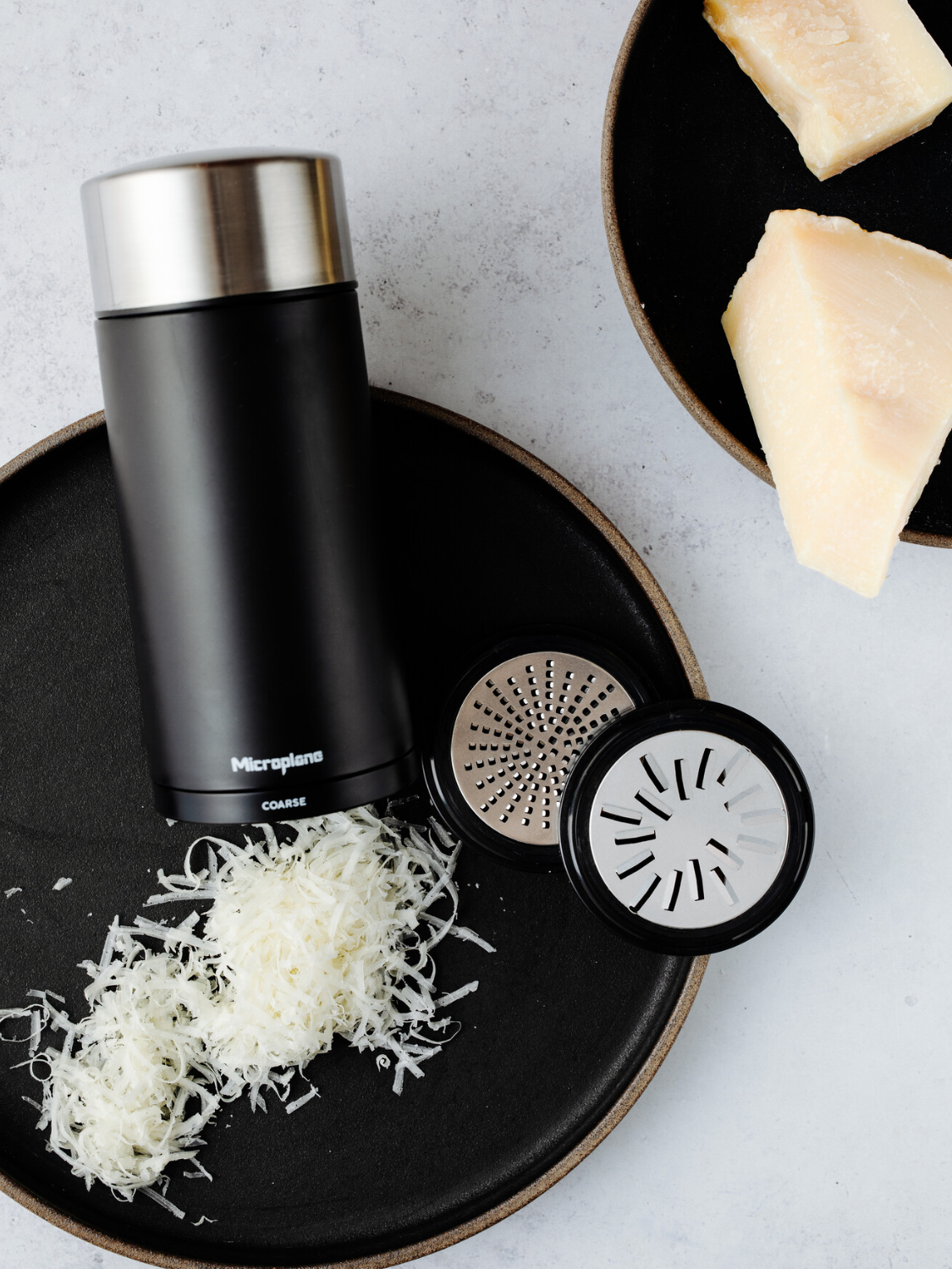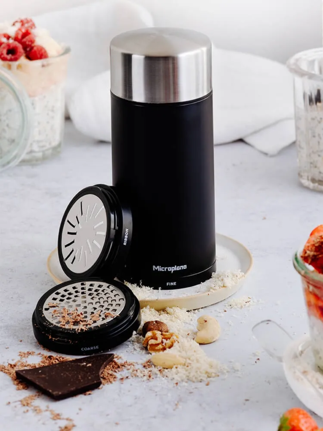 De Microplane Universele Molen met 3 messen is een veelzijdig keukenhulpje voor het raspen van harde kazen, kruiden, chocolade, noten en meer. Dankzij het slimme draaisysteem werk je net als met een pepermolen: draaien en raspen zonder moeite.